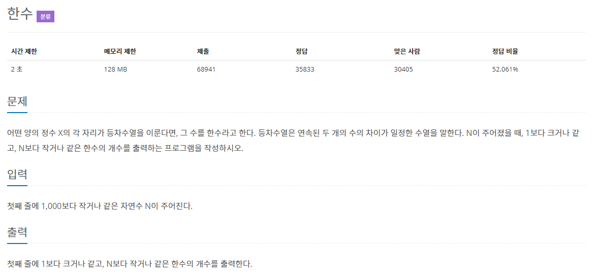 99이하의 자연수는 모두 한수가 되므로 99이하의 양의 정수가 주어졌을 때는 한수의 개수가 그 양의 정수 값이 된다.