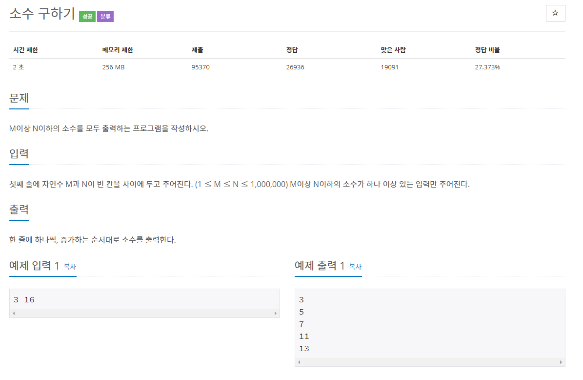 문제는 간단합니다. 두개의 자연수 사이에 존재하는 소수를 뽑아내기만 하면됩니다.