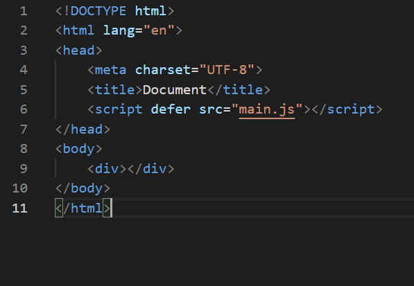 이 경우는 defer을 사용하는 것이다. 앞에서와 마찬가지로 head안에 script를 넣고 정의하는데 이 경우는 parsing 하다가 script에 defer를 보고 main.js 다운 명령만 시켜놓고 나머지 html을 끝까지 parsing한다. 그리고 마지막에 parsing이 끝난 다음에 다운로드된 main.js를 실행한다. 때문에 defer를 사용하는 것이 가장 좋은 옵션이라고 할 수 있다.