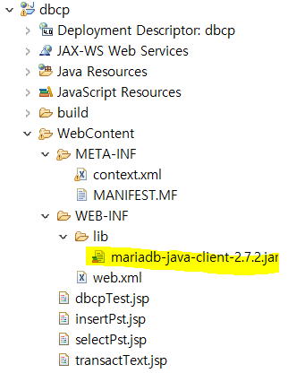 위와 같이 mariadb jar파일과 두개의 xml파일이 준비되었다면 커넥션 풀을 사용할 수 있다.