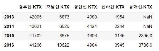 df_KTX = pd.DataFrame(KTX_data, columns = col_list, index = index_list)