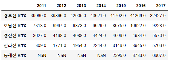 '동해선 KTX': [np.nan,np.nan,np.nan,np.nan,2395,3786,6667]}