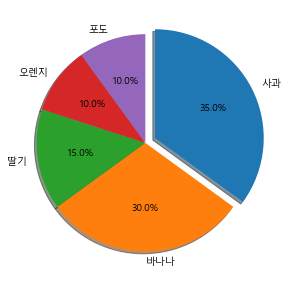 plt.pie(result, labels=fruit, autopct='%.1f%%', startangle=90, counterclock=False, explode=explode_value, shadow=True)