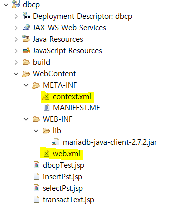 위와 같이 mariadb jar파일과 두개의 xml파일이 준비되었다면 커넥션 풀을 사용할 수 있다.