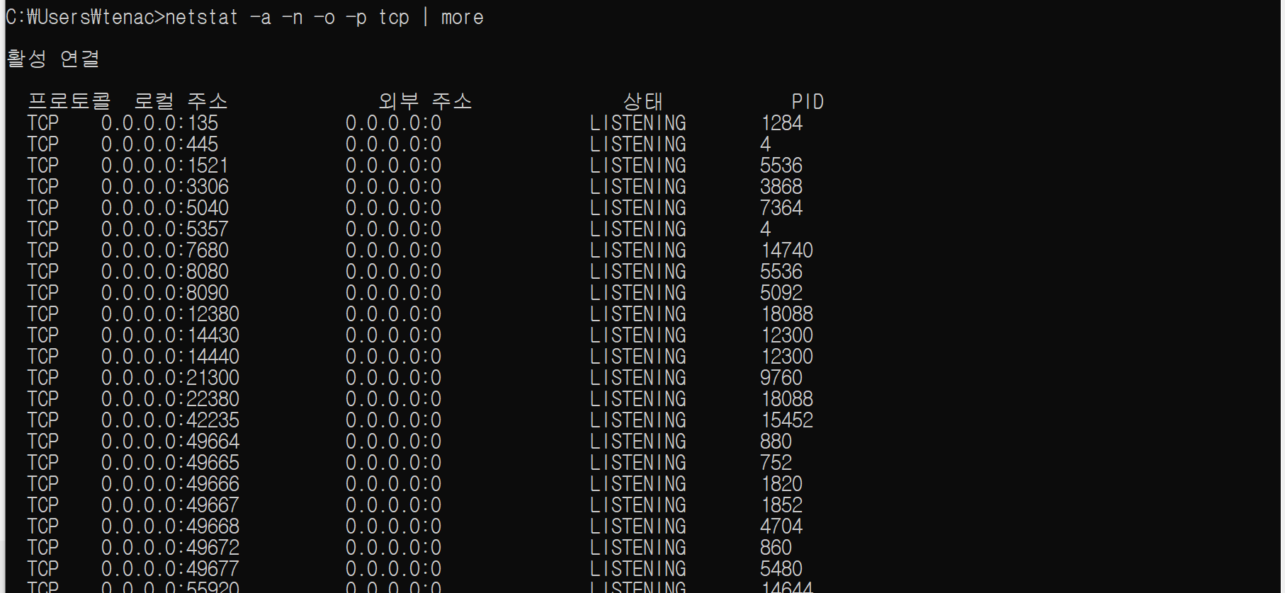 netstat -a -n -o -p tcp | more 를 입력하여 tomcat이 사용하는 pid를 확인한다.